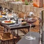 The 4-star hotel presents guests with beautifully appointed rooms, where the rustic allure of stone walls and wooden ceiling beams meets sophisticated decor elements such as shaggy rugs, retro-style lamps, and bathrooms adorned in black and gold. Each room guarantees comfort with premium bedding, air conditioning, and a garden view balcony, ideal for relishing a glass of wine or enjoying breakfast.